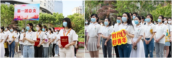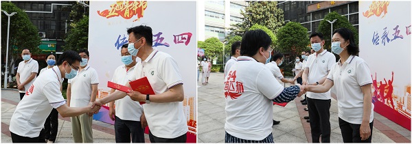 青春之火,为人民而燃烧;青春之心,为祖国而跳动。颁奖现场,一副巨大的背景板上描绘着“传承五四精神,绽放战疫青春”的活动主题,广场四周装点着五四青年节拍照相框,团员青年们以总支为单位,高举着各种五四手幅站立在广场中央。